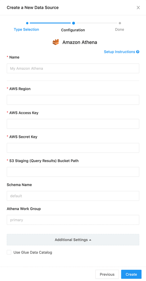 In DataReporter, in the New Data Source page select “Athena” as the data source type and fill out the details using the information from the previous step: