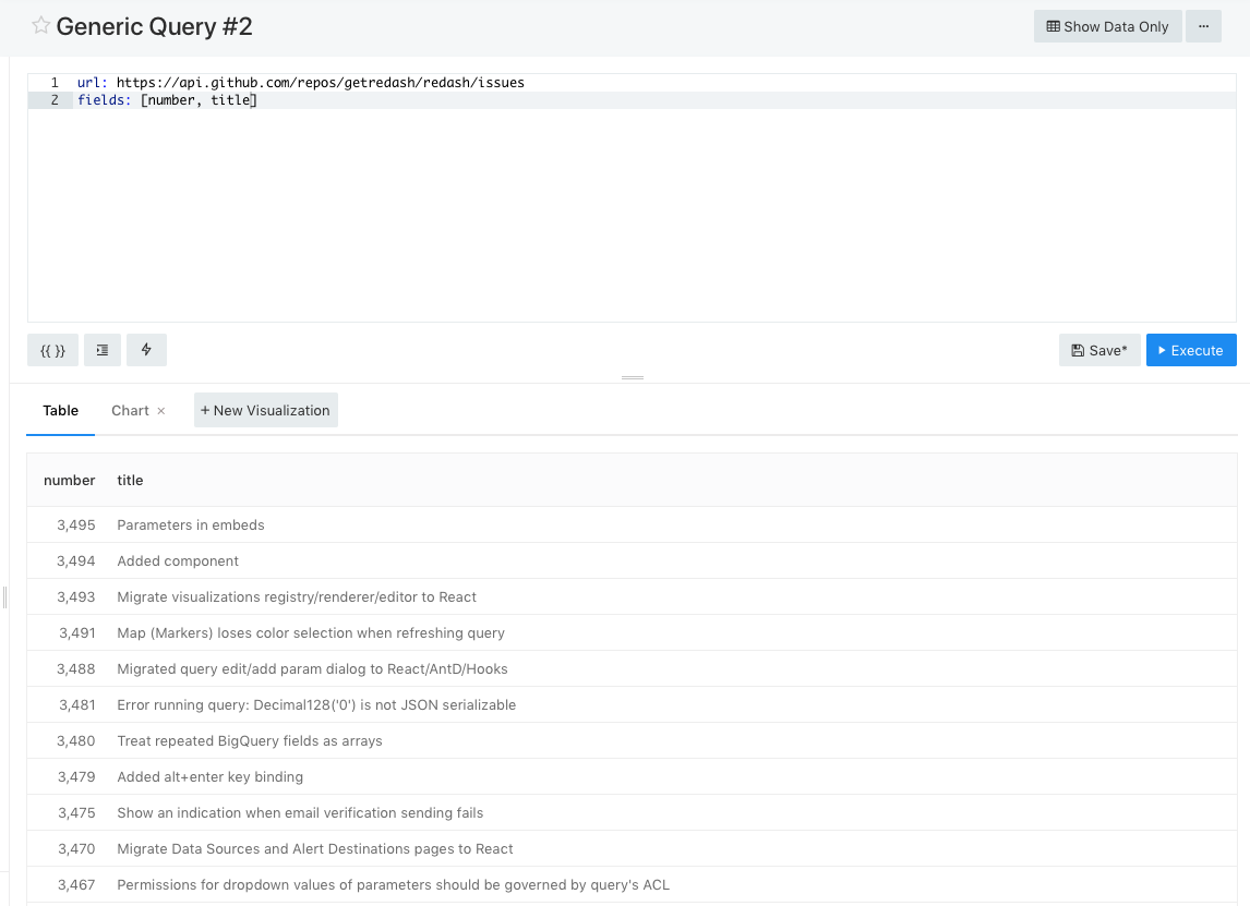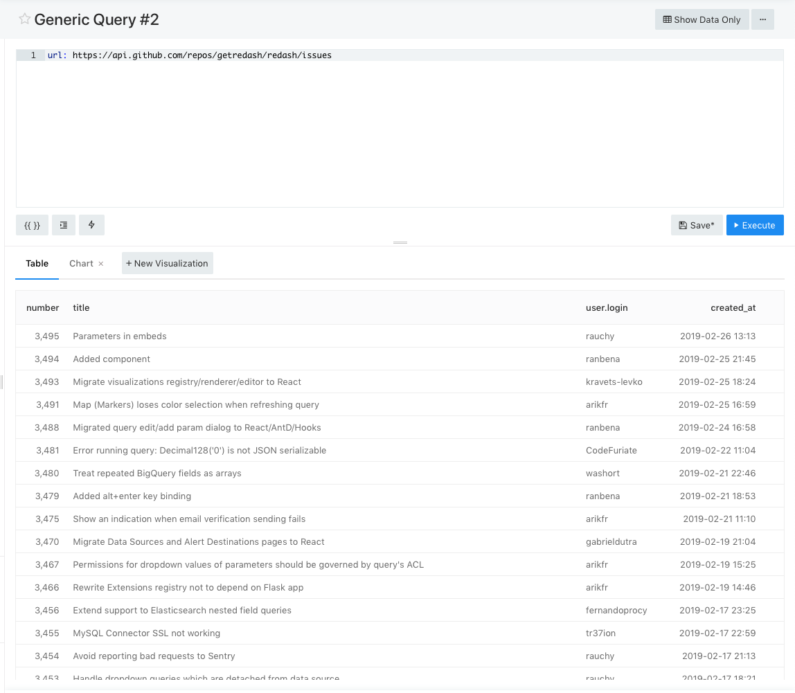 This Data Source takes queries in YAML format. Here’s some examples using the GitHub API: