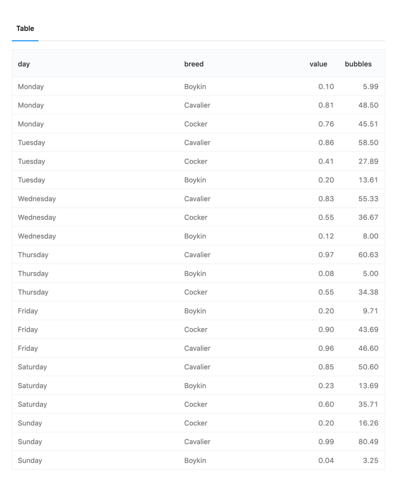 The charts in the above animation were all produced from the following tabular result: