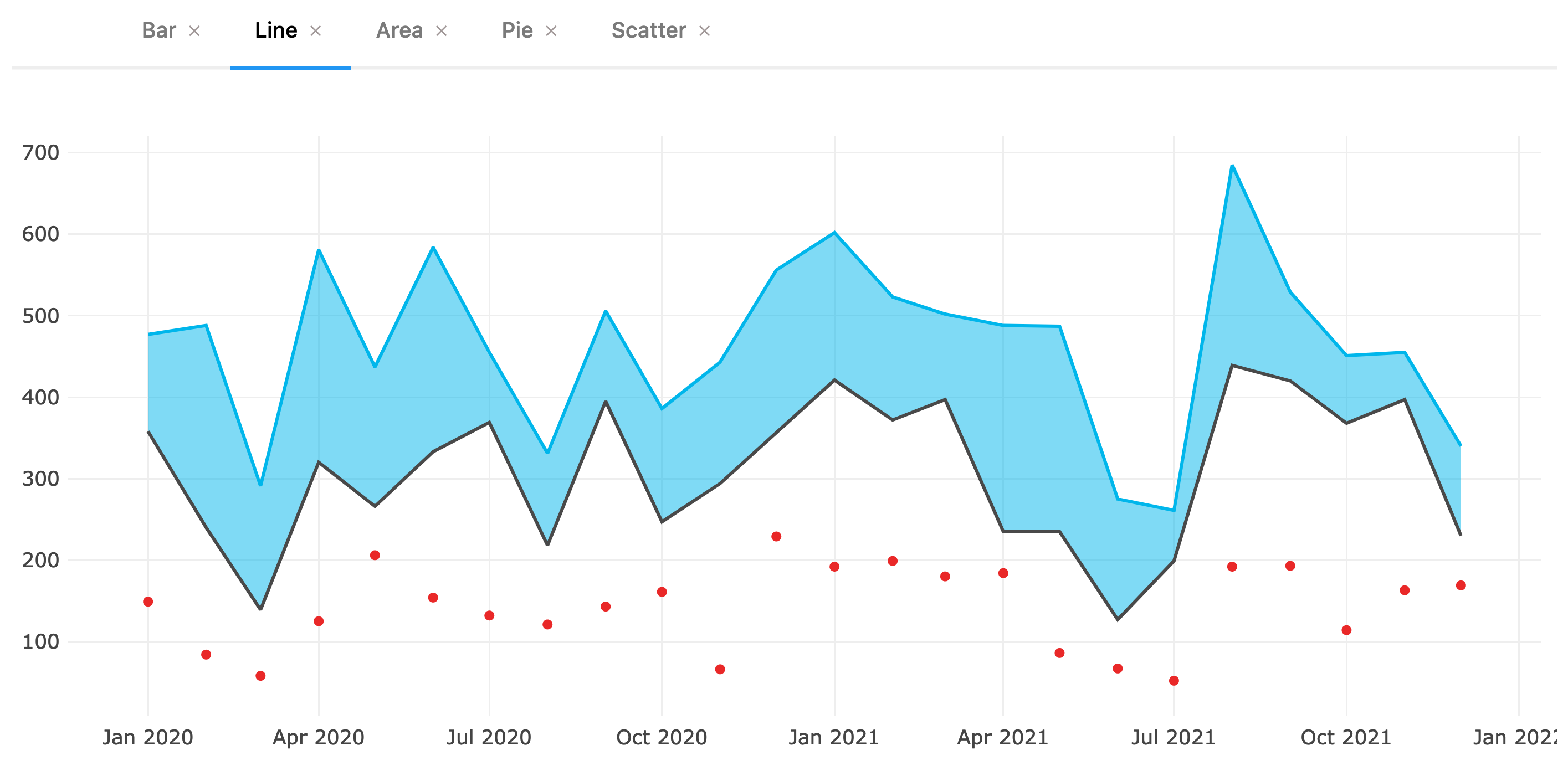 - Area charts are often used to show sales funnel changes through time. They are frequently combined with Stacking to grant a broader picture.