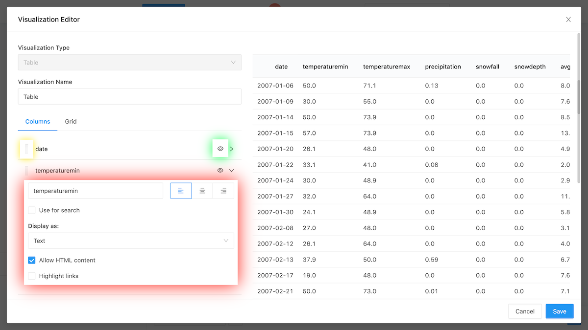For data sources that support a native query syntax (SQL or NOSQL), you can choose your data return format, which columns to return, and in what order by modifying your query. But sources like CSV files or Google Sheets don’t support a query syntax. So DataReporter allows you to manually reorder, hide, and format data in your table visualizations.