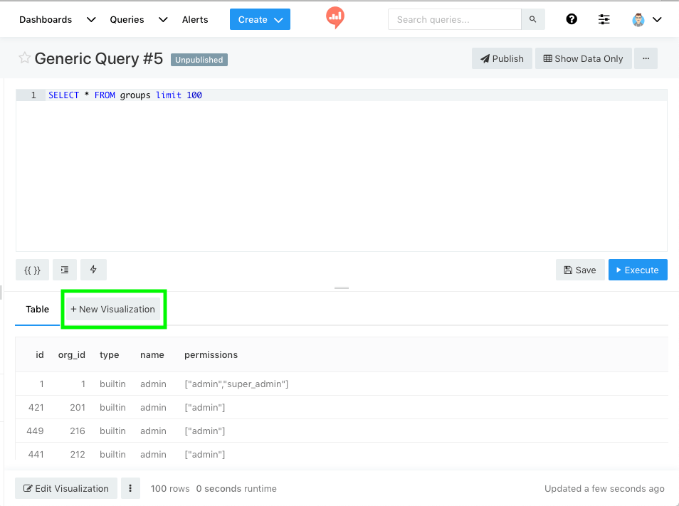 Once your query has finished running for the first time, you can add a visualization by clicking the “New Visualization” button above the results table.